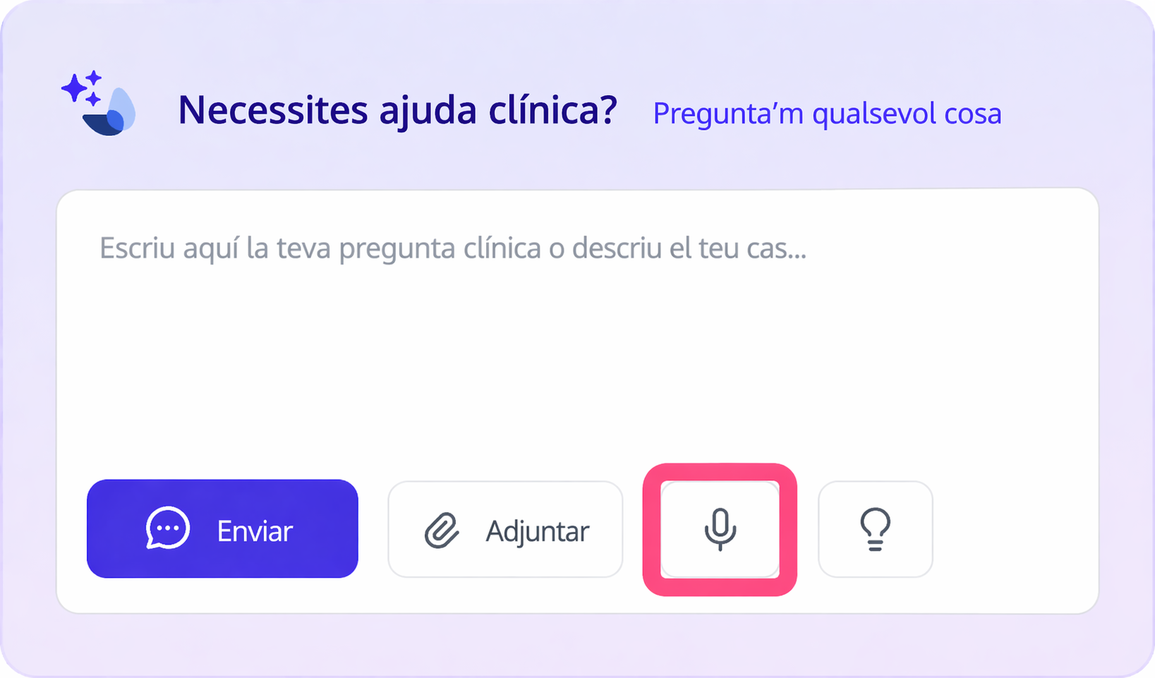 A la part inferior del tauler de conversa, al costat de l'espai on escrius la consulta, trobaràs la icona per gravar el missatge de veu. En fer-hi clic es transcriurà automàticament com a text al camp de consulta.