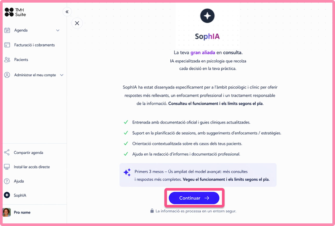SophIA és la solució d'Intel·ligència clínica integrada a TMH Suite, dissenyada específicament per i per a psicòlegs. Per començar a fer servir SophIA només necessites completar 3 passos:
