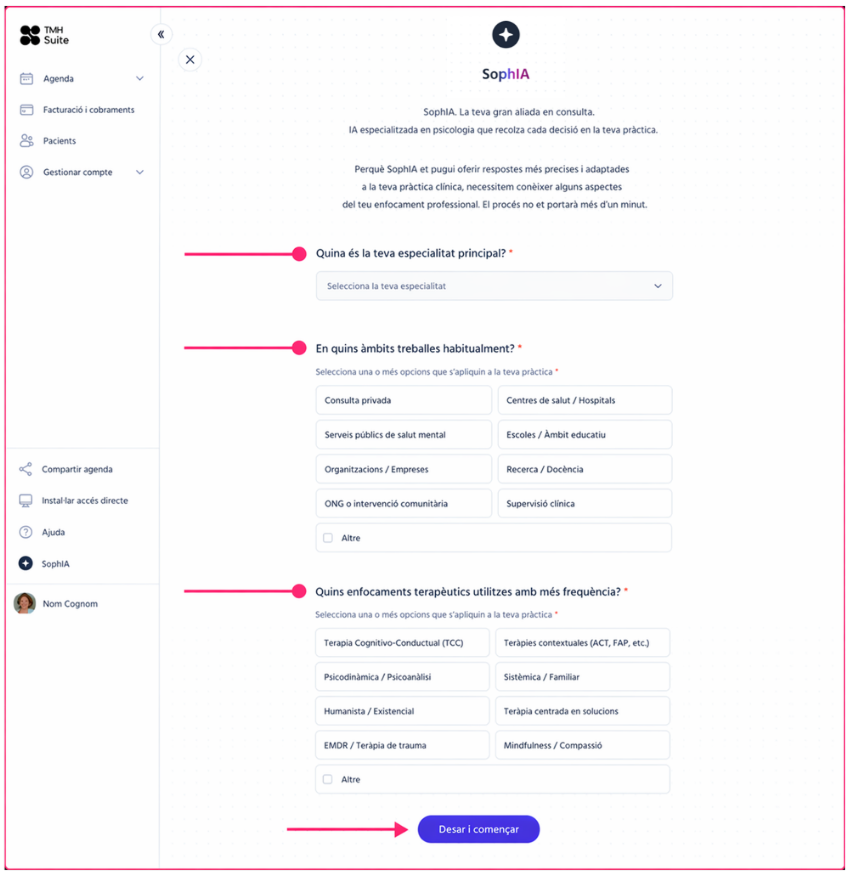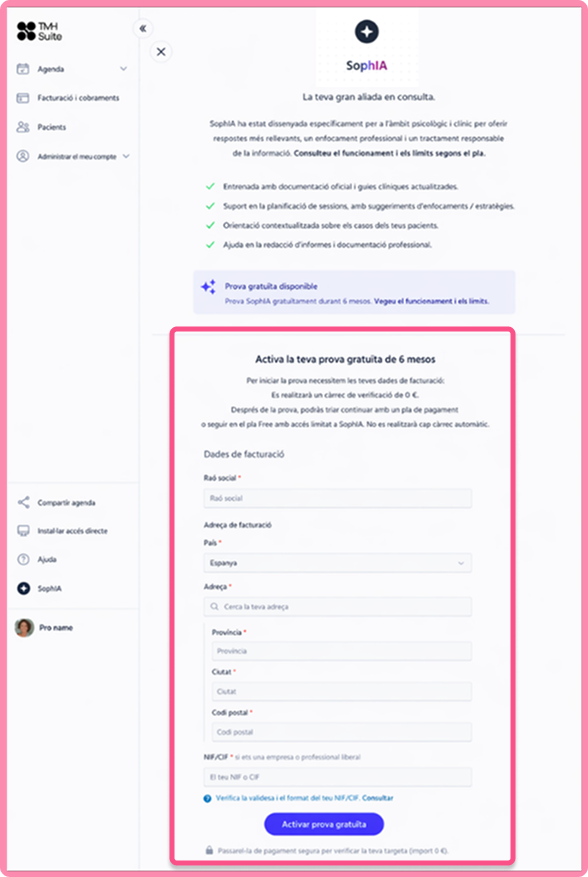 Un cop validades les dades de facturació, SophIA et sol·licitarà informació addicional per poder oferir-te respostes més precises i adaptades a la teva pràctica clínica.