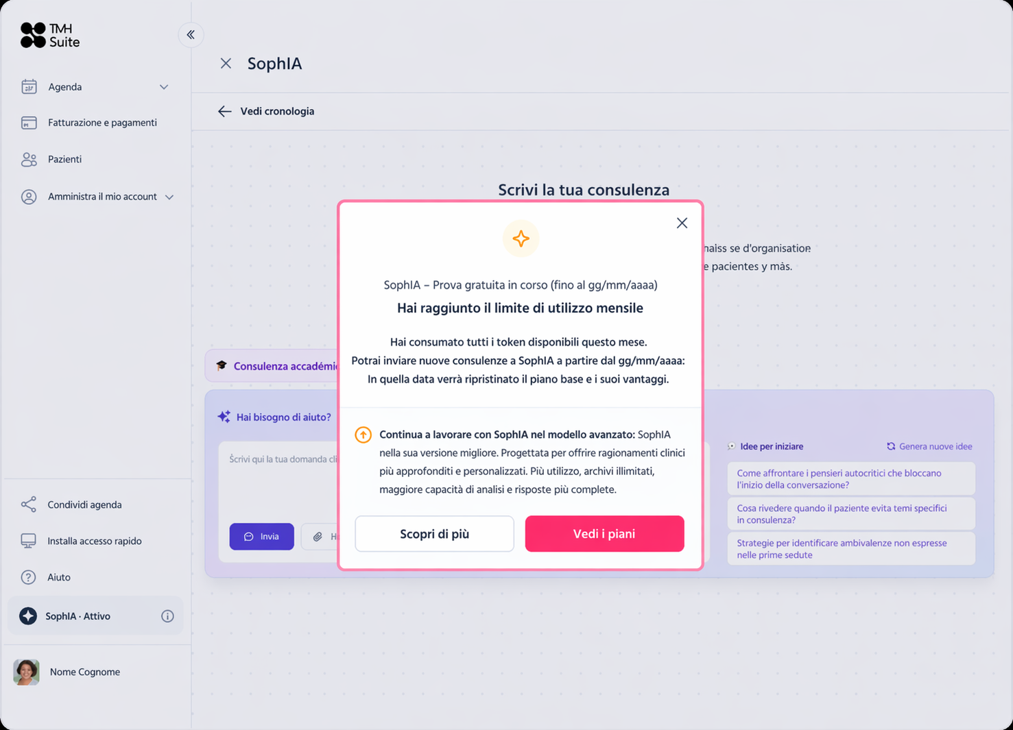 Una volta esauriti tutti i token* (avanzati e base), visualizzerai un messaggio di avviso con indicazione della data in cui i tuoi token verranno ricaricati, consentendoti di effettuare nuove consultazioni su SophIA.