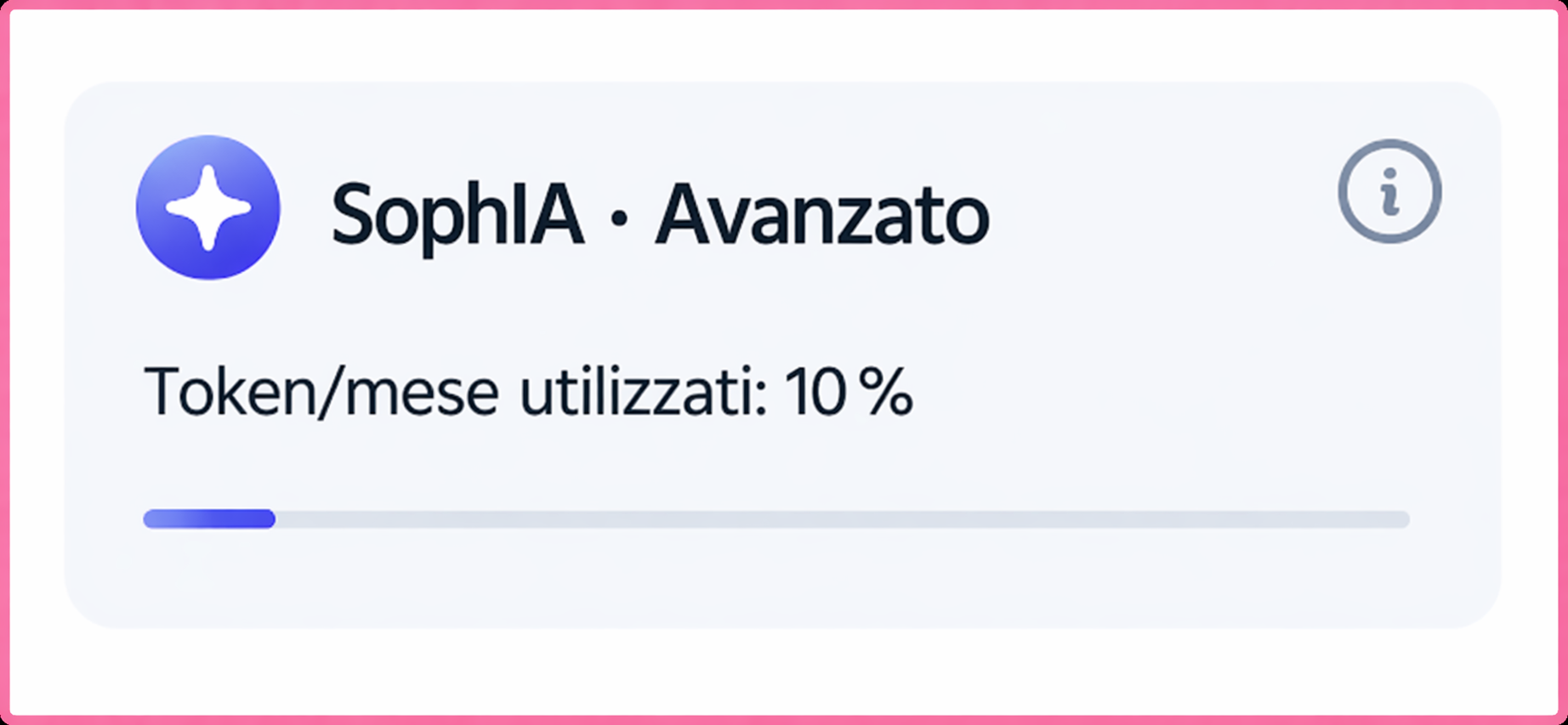 SophIA include una barra di consumo mensile sempre visibile che consente di visualizzare chiaramente e in ogni momento la % di token utilizzati e la quantità ancora disponibile.