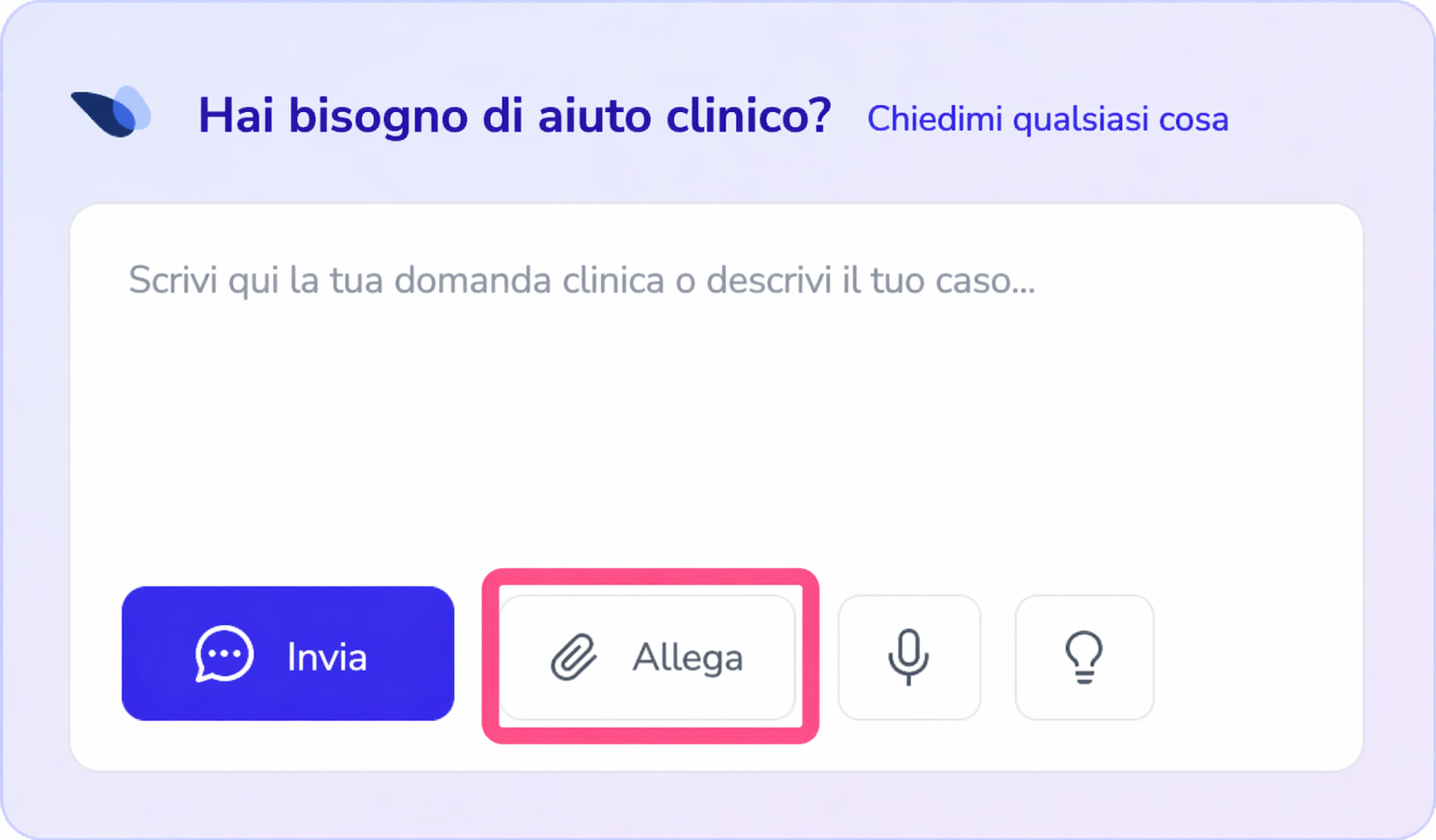 💡TIP d’uso: per fare di SophIA la tua miglior alleata fin da subito, fornisci il contesto necessario. Nell’avviare un nuovo caso con un paziente, prova a caricare la sua anamnesi o le valutazioni precedenti. Disporre di questo quadro di riferimento ti consente di usufruire di risposte molto più personalizzate, rigorose e utili per il tuo processo decisionale.