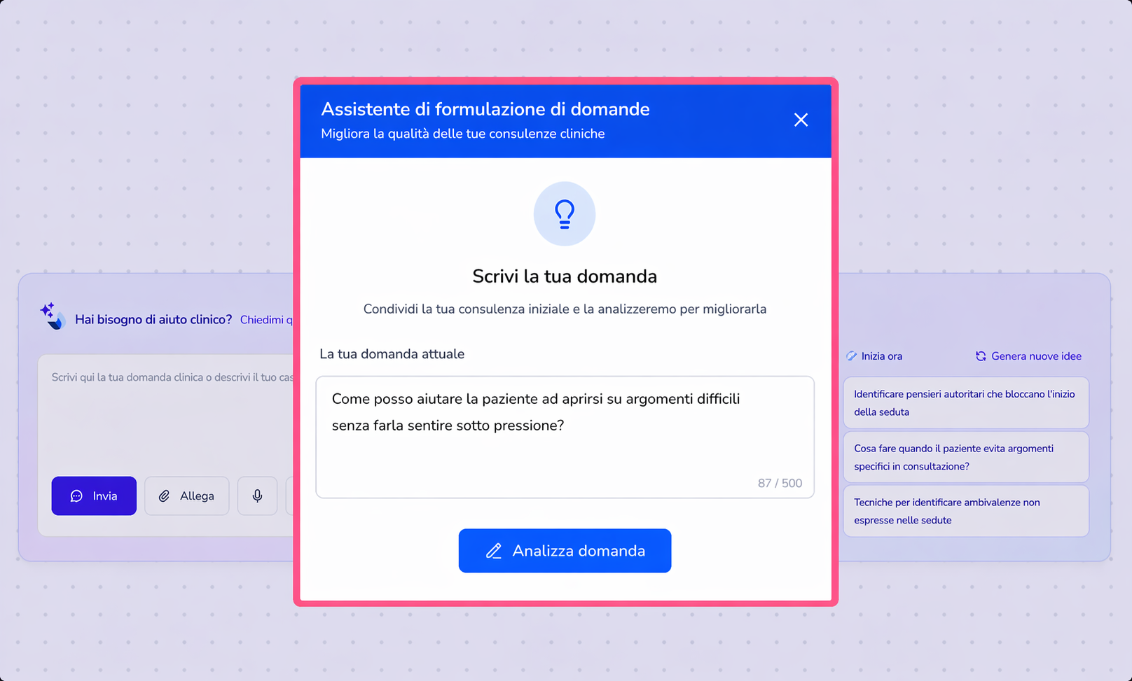 Questo strumento ti aiuta a riformulare la tua domanda per ottenere risposte più chiare, precise e complete. Per utilizzarlo: