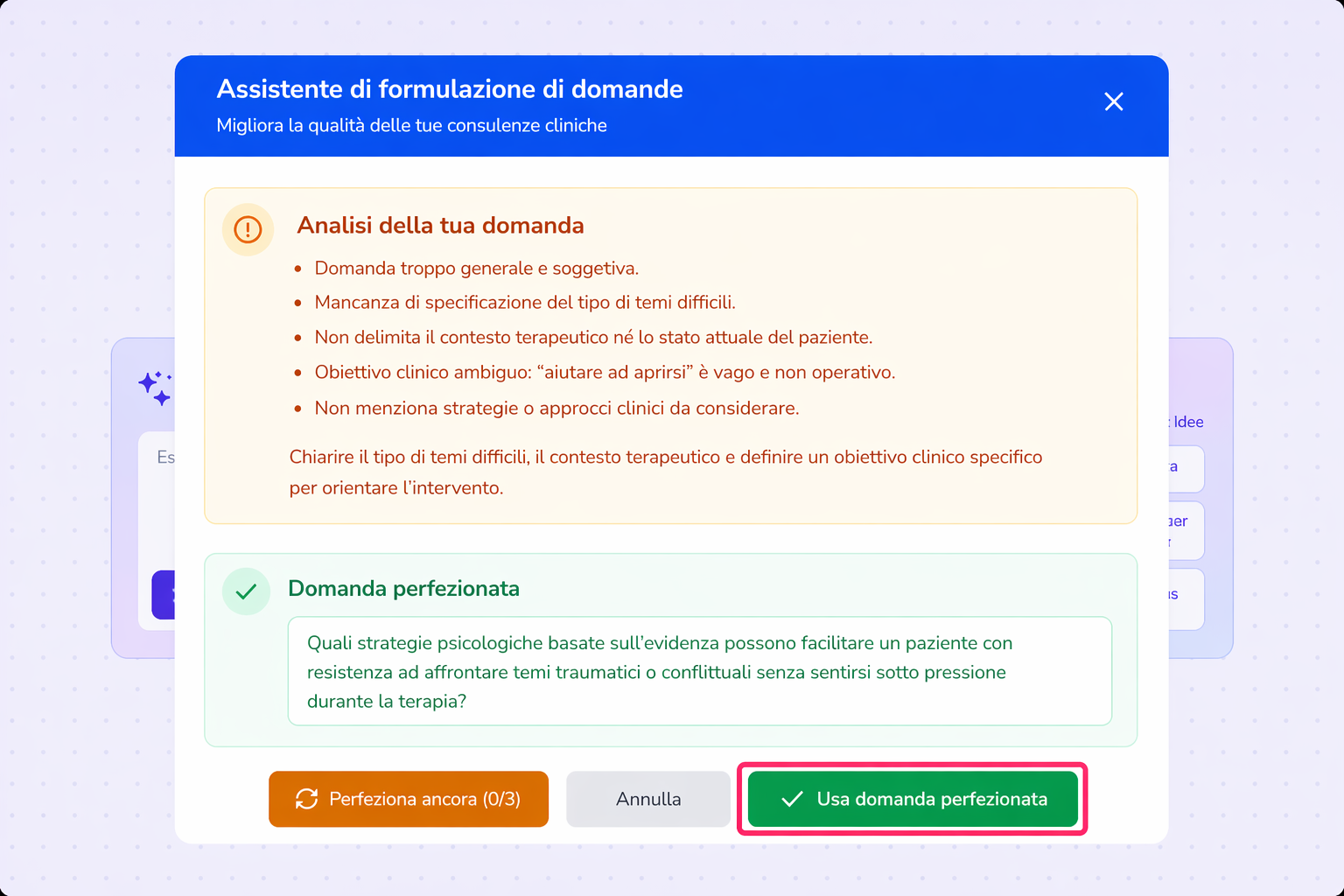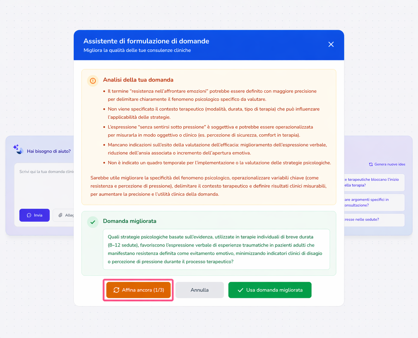 Potrai perfezionare la tua consultazione fino a tre volte, modificando la formulazione della domanda prima di inviarla.